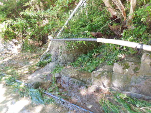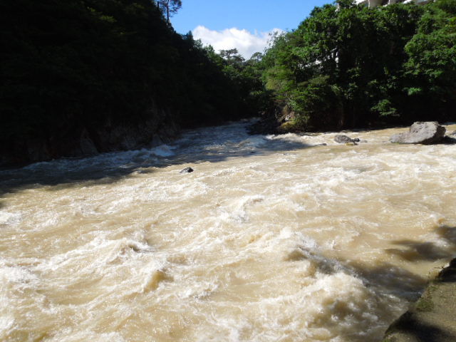 台風一過のすばらしい青空です。 が、 昨日の台風5号の通過はすさまじかったです。 夜暗くなる前には、まだ和歌山や三重、愛知あたりにいて、 このあたりは、まだ雨も風も強くなく、 目の前を流れる箒川の水もそれほど多くなかったのに・・・・ まず、夜22時頃から、雨が一気に強くなり、 調理場の勝手口の前が池のように。 玄関前も浸水してくるかと思うほどでした。 そして夜23時頃に、 川沿いにある温泉ポンプ小屋まで見周り点検に行ったスタッフから 「川沿いの遊歩道がすでに水をかぶってます」という報告。 ポンプ小屋まで行きつけず、戻ってきました。 川を石がゴロゴロと音を立てて流れ、 大きな石がぶつかり合う、大きな音もしてきます。 地響きのような音です。 外は真っ暗だし、濁流にのまれでもしたら大変です。 それ以上、夜は何もできず、一夜開けると・・・ 雨は夜中の2時過ぎには小降りになっていたものの、 予想以上の台風4号の威力に驚くことに。 遊歩道は完全に水をかぶっていました。 彩つむぎテラスより、