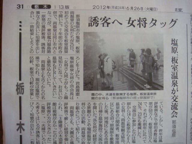昨日も今日も湿度が比較的低く、さわやかな天候です。 さて、お伝えしたように、塩原温泉と板室温泉の女将さんたち、 一緒に沼ッ原湿原を歩きましたが、 その後、昼食を食べ、交流会を持ちました。 それぞれの温泉地の説明や、観光スポットの紹介。 そして、一人一人が自己紹介と自館のPRを。 観光協会や旅館組合の方も同席し、 とても有意義な時間が持てました。 印象的だったのは、車で40分くらい。 一番近い温泉地同士なのに、 板室温泉に来たのは今回が初めてという方が何人もいたこと。 そして、それぞれに、豊かな自然や良質の温泉など、 すばらしい観光資源が沢山あることなどなど。 今後は自館のお客様に、 それぞれの観光スポットを紹介し、 お互いに、持ちつ持たれつで、 誘客につなげることができればと思いました。 また同じ市内の温泉地ということで、 協力し合いながら、観光PRなどができるといいですね。 交流会の様子。2012年6月26日 09:50