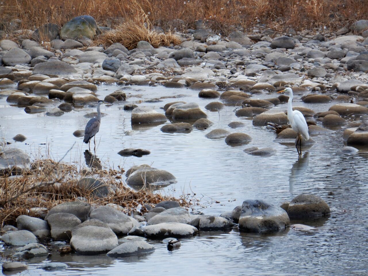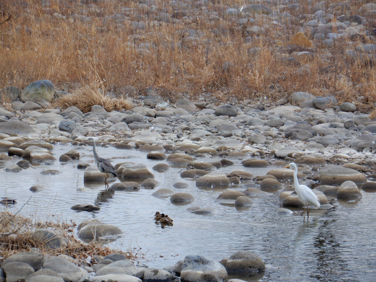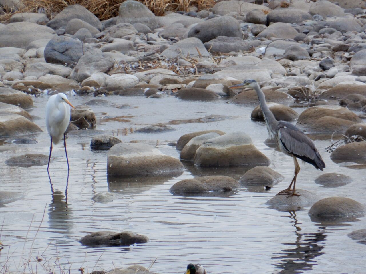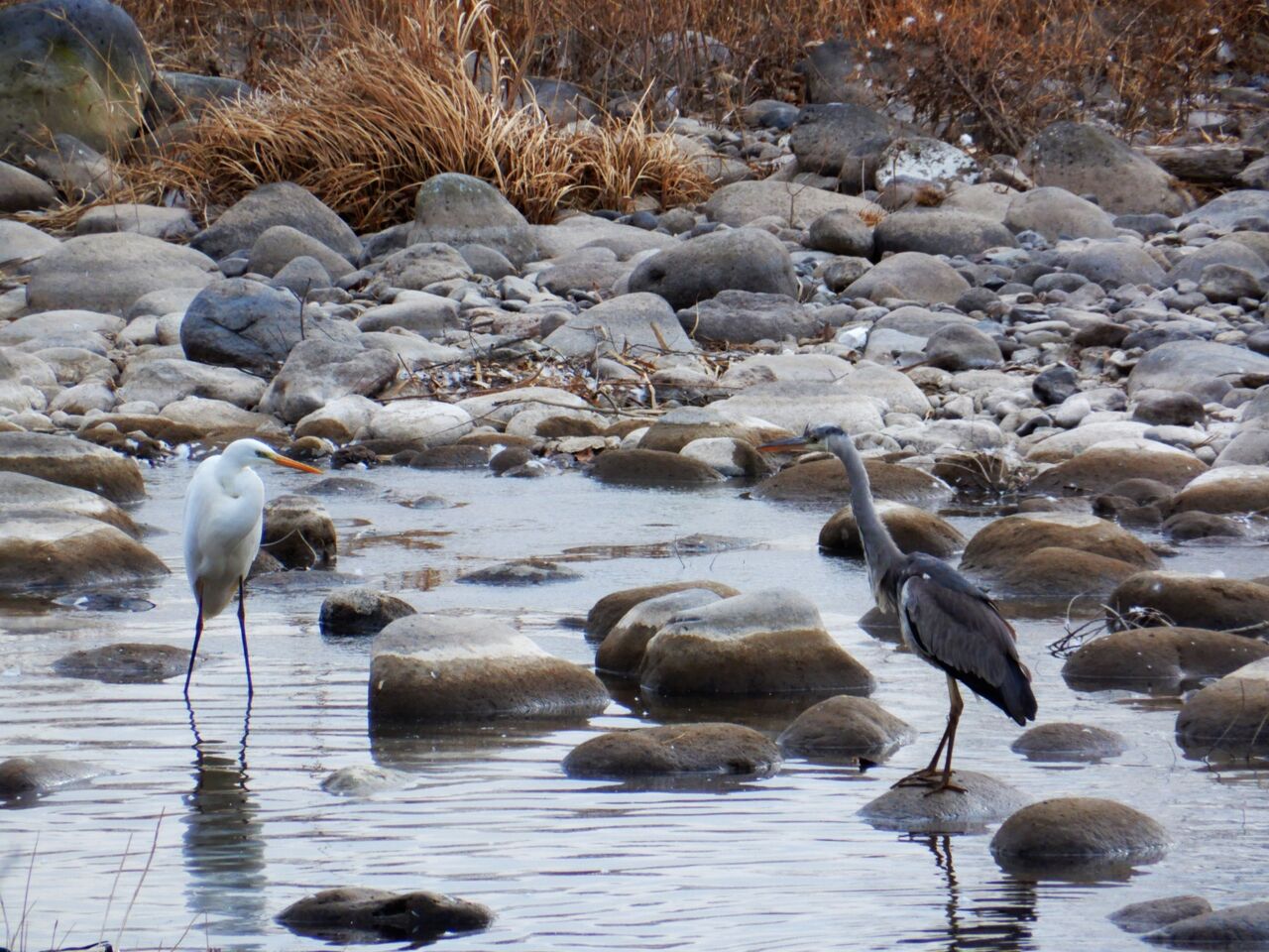 昨日までくもり予報だったのに、 午前中晴れに変わってました。 午後はくもり、明日は晴れるようです。 昨日一日降り続き、 10センチくらいの積雪になった雪は夜に止んだものの、 道路にはかなり雪が残っていて、凍結しています。 運転や歩行には充分注意してください。 さて、一昨日紹介した塩谷町の鬼怒川の白鳥飛来地の続きです。 沢山の白鳥に混じって、 2羽のサギがいたのに気が付きました。 まるで侵入者のように、 端っこでひっそりとしてはいたのですが、 ダイサギ(シロサギ)とアオサギがそれぞれ1羽ずつ。 見つめあったり(けん制してた?)、 追いかけたり、追い払ったり。 仲がいいのか悪いのか。 2羽の関係が今一つわからないものの、 この2羽のやり取りがとても面白くて、 白鳥よりも興味深く見ていました。 そういえば秋の終わりごろ、 塩原温泉の箒川でも ダイサギとアオサギが1羽ずついるのを見かけ、 ブログに書いたのが記憶に新しいです。 再び見ることができるとは。 サギ類は大きくて動きも面白いので、 ずっと見ていても見飽きません。 また出会えるといいな。 ![]() ![]() ![]() ![]() ![]() ![]() ![]() ![]()