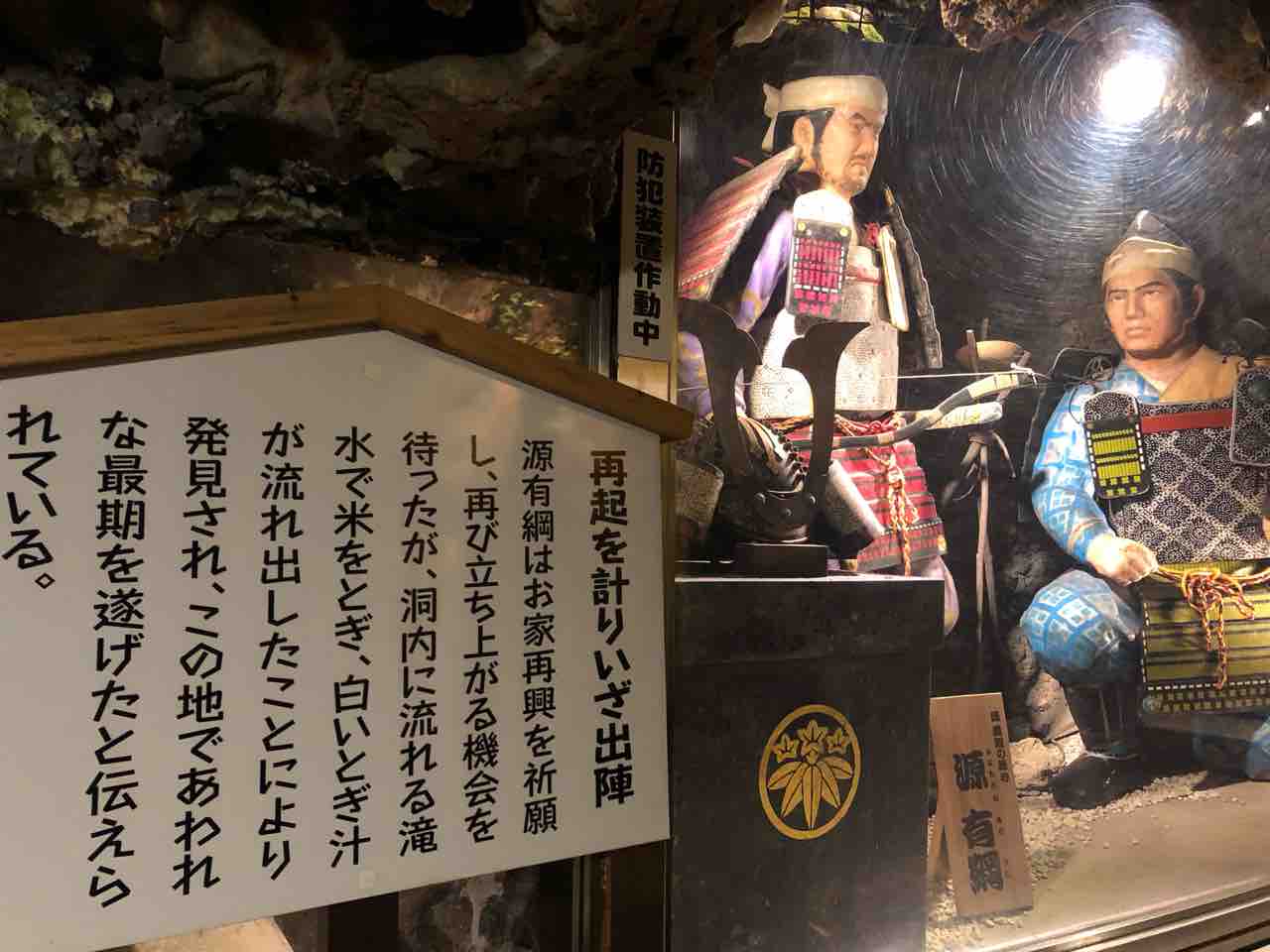 日中晴れマークが並んでいるので、 良い天気になると思います。 しばらく良い天気ですが、週末少し崩れそうです。 さて、氷瀑が見られた源三窟ですが、 こちらも《塩原のんびり湯っくり雛めぐり》に参画しています。 源三窟は、源義経に味方し、 源頼朝の追手から逃げていた、 源三位頼政の孫、源有綱が隠れていたところを 米のとぎ汁が流れているのが見つかり、 自害したという伝説のある場所。 小さいながらも複雑に入り組んだ鍾乳洞になっていて、 鍾乳洞自体も一見の価値あり、 人形とアナウンスが有綱の悲哀を感じさせます。 鍾乳洞を出た所に、お雛様。 甲冑や大名籠と一緒に展示されているのが、 何ともユニーク。 この先に武具を展示してあるコーナーがあり、 ここがまた一見の価値あり。 明日別途詳しく紹介します。 源三窟入口。 なぜか最初に一休さんがお出迎え。 入ってすぐの所に米とぎしている姿。 鍾乳洞の中に滝があります。 源有綱達の悲話を再現している歴史スポット。 同時に鍾乳洞についての説明。![]() ![]() ![]() ![]() 鍾乳石の切り口。![]() ![]() 化石もあるようです。 鍾乳洞から出て武具資料館への入り口。 武具資料館に入ってすぐの所に、ありました! こういう場所に飾られていると、それだけで、風格が感じられます。 |