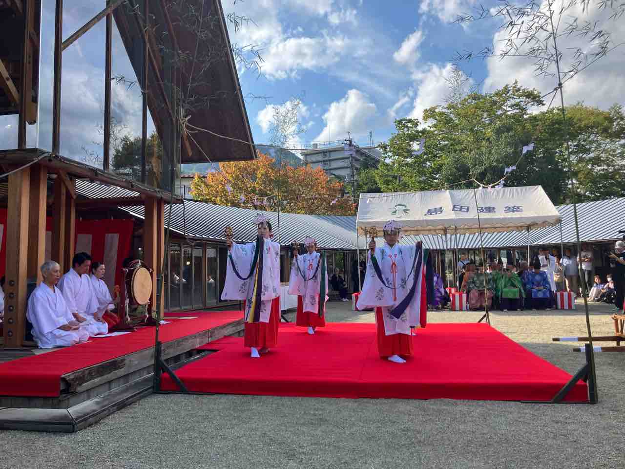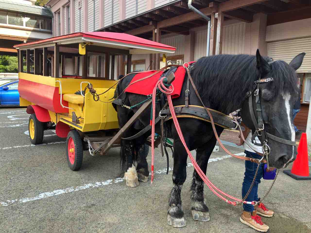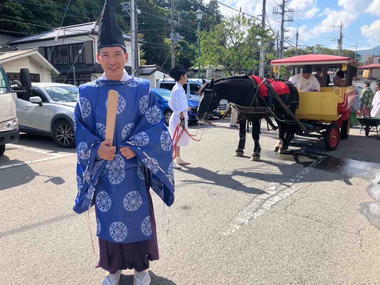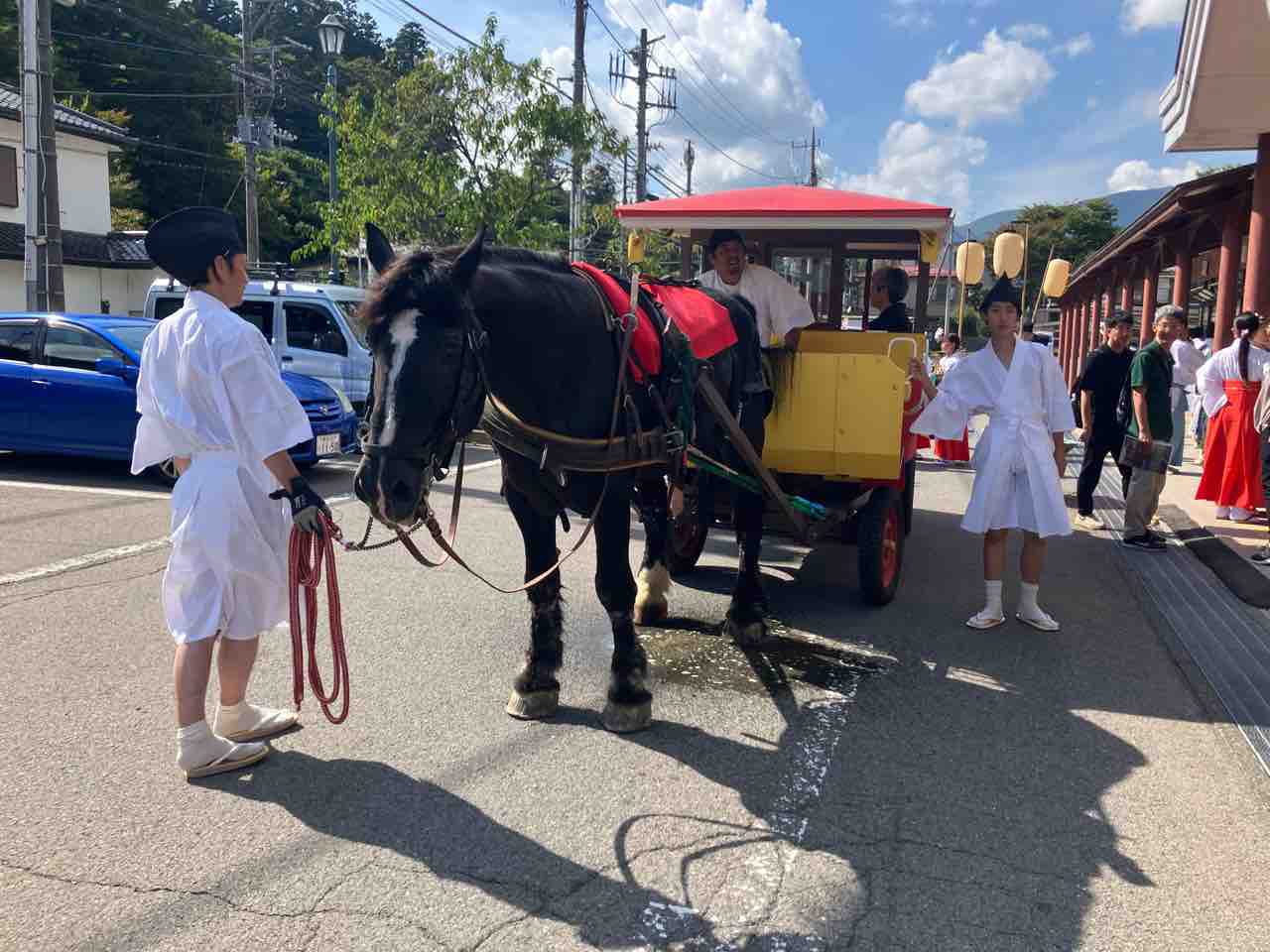 予報ではくもりだったような?と。 今朝になったら日中晴れ予報になっていました。 今日明日とまずまずの天気に恵まれます。 さて、昨日は塩原温泉古式湯まつり、 青空の下、滞りなく行われました。 昨日も予報ではくもりだったんですけど、 晴れて、暑くなりました。 塩原温泉発祥の地である、 塩原元湯の源泉を汲んで「ご神湯」として湯汲み式、 その後、塩原八幡宮にご神湯の奉納、 さらに、塩原支所から足湯公園湯っ歩の里まで ご神湯を運ぶ分湯行列、 湯っ歩の里での巫女舞奉納、分湯式と続きます。 あまりちゃんとした写真は撮れませんでしたが、 ちょっとだけ雰囲気が伝わるでしょうか。 分湯行列が通る、途中の源三窟では、 那須塩原青年会議所と、 那須塩原市観光局の協力のもと、 初の試み「まるっとゆ〜フェス」が行われたほか、 この日限定で、とて馬車が復活。 とて馬車は分湯行列にも参加してくれました。 千本松牧場のお馬さん「れん」君が頑張ってくれました。 お馬さんの優しい眼と美しい毛並みに、 皆が癒されていたように思います。 実はこの後紅葉時期に何日か、 またとて馬車が復活する日がありそうなので、 お知らせておきますね。 | ![]() |