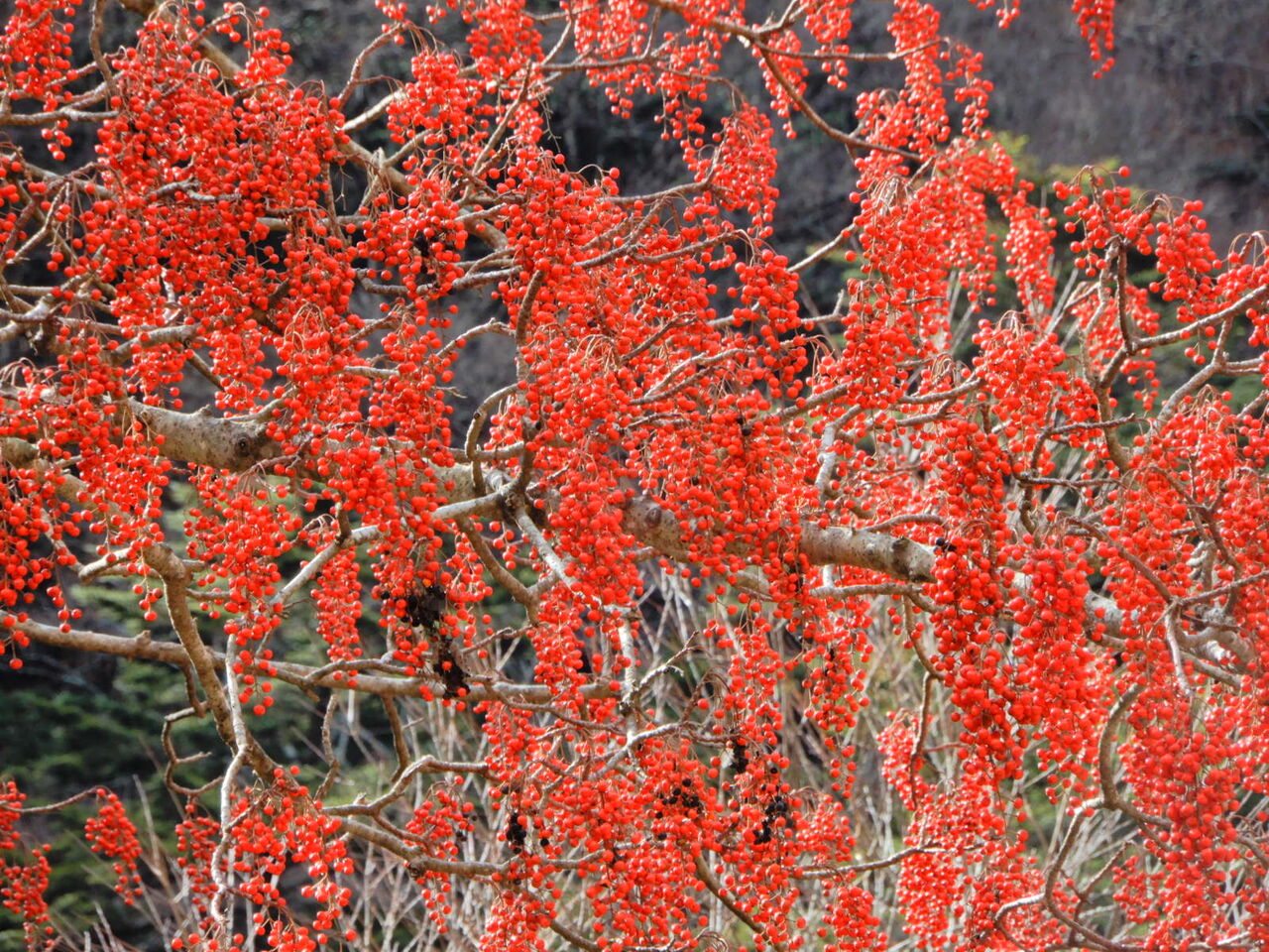 ですがこの後くもり予報。 明日もそんな天気になりそうです。 風がないので、それほど寒くは感じません。 クリスマスが近づいています。 そんな季節に天然のクリスマスツリーを。 イイギリの木です。 かつてこの木の大きな葉でご飯を包んだりしたことや、 ちょっと桐の木にも似ているということから イイギリの名前がついていますが、ヤナギの仲間だそうです。 大きくなります。 塩原街道(国道400号)の がま石トンネルの出入り口から 大網温泉に向かって曲がる所で、かなり目を引きます。 真赤な実がたわわにぶら下がって、 まさにクリスマスツリーのようです。 塩原には多いかも。 塩原街道旧道沿いの箒川に近い場所や、 塩の湯に行く途中にも何本かありますが、 この場所にあるのが最も大きいかな。 今年はとりわけ実付きがいいのではないでしょうか。 この木にイルミネーション付けたらきれいだろうなあ。 この季節、他にもクマヤナギなど、 赤い実がなる木を探すのも楽しいですね。 ![]() ![]() ![]() |